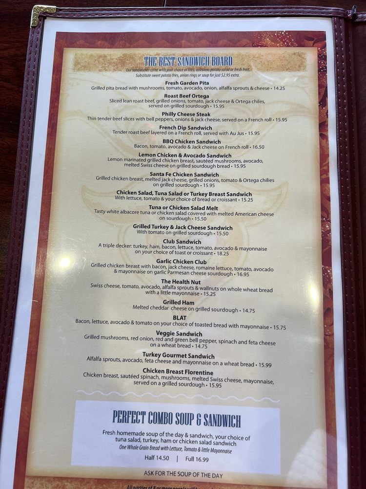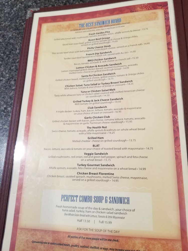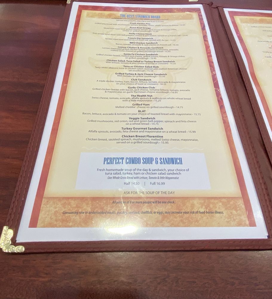 Fresh homemade soup of the day and sandwich, your choice of tuna salad, turkey, ham, or chicken salad sandwich. Served on whole wheat bread with lettuce, tomato, and light mayo.