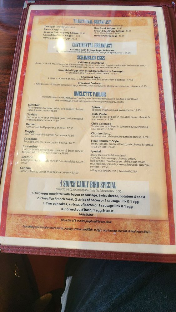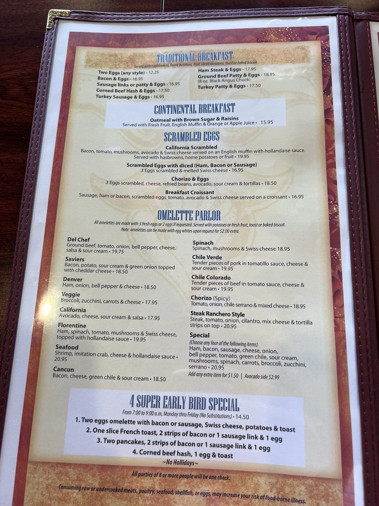 Bacon, cheese, green chile, and sour cream. Served with potatoes or fresh fruit, toast or baked biscuit.