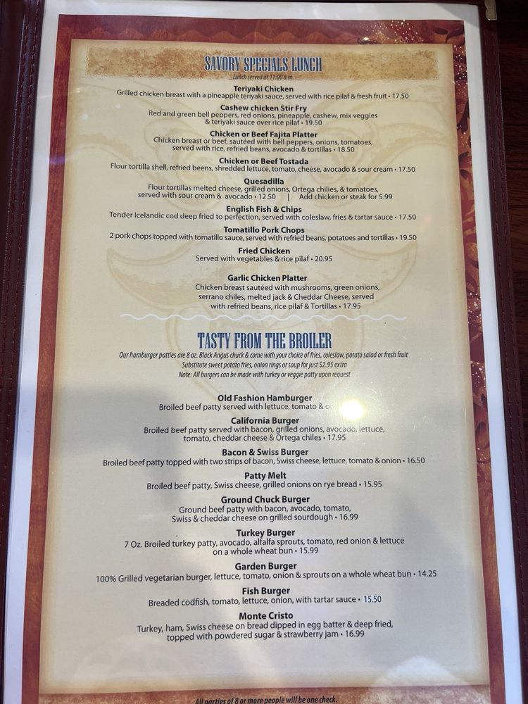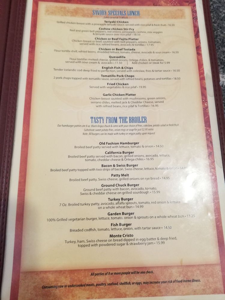 Broiled beef patty served with bacon, grilled onions, avocado, lettuce, tomato, cheddar cheese, and Ortega chiles. Served with your choice of fries, coleslaw, potato salad, and fresh fruit.