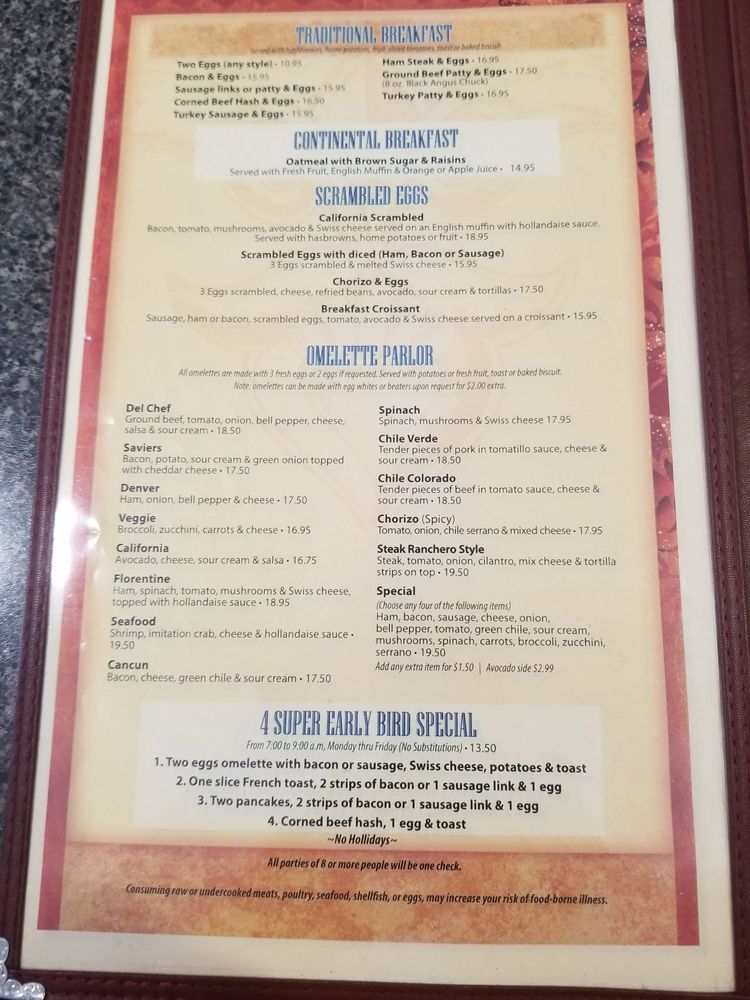 Tomato, onion, chile serrano, chorizo, and cheese. Served with potatoes or fresh fruit, toast or baked biscuit.